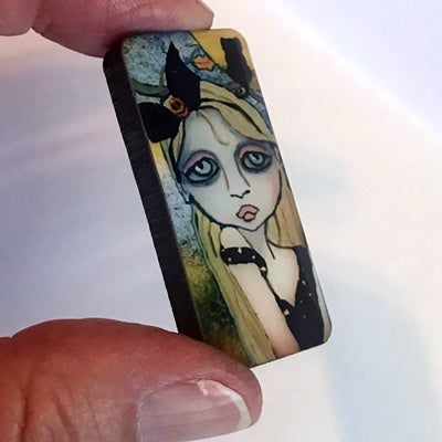7/8" x 1 7/8" and 5mm thick domino shape with image embedded onto the composite base with a layer of resin to give it a glass like appearance.