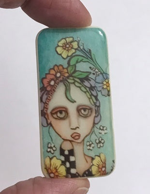 7/8" x 1 7/8" and 5mm thick domino shape with image embedded onto the composite base with a layer of resin to give it a glass like appearance.