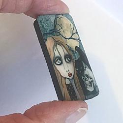 7/8" x 1 7/8" and 5mm thick domino shape with image embedded onto the composite base with a layer of resin to give it a glass like appearance.
